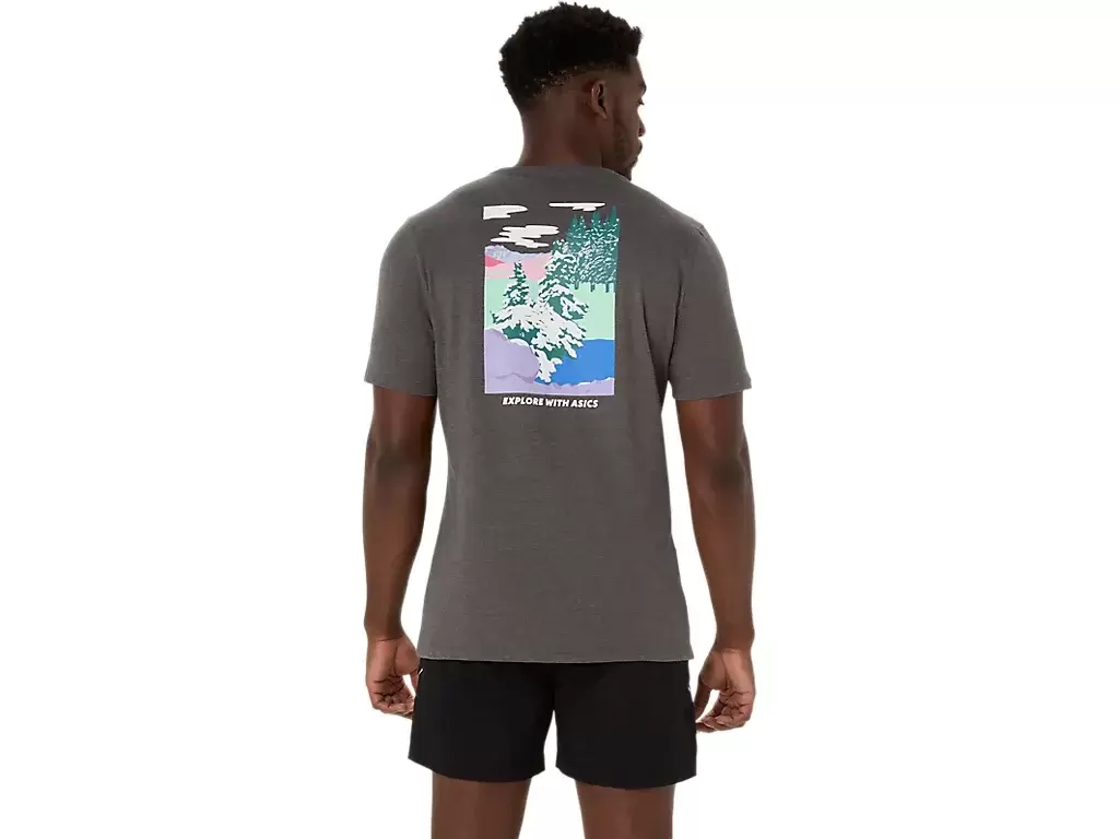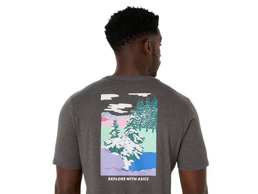 This comfortable knit short sleeve tee takes inspiration from scenes in nature. It features a serene forest graphic that’s met with the phrase, “”EXPLORE WITH ASICS”” across the chest.